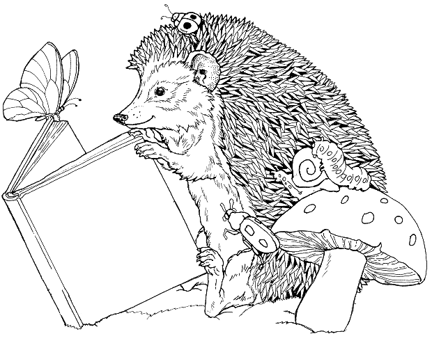 Un herisson qui lit un livre a cote d un champignon