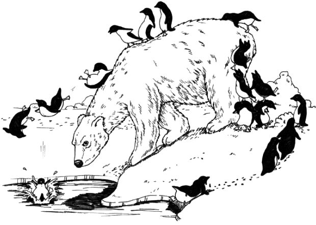 un ours polaire qui joue avec des pingouins